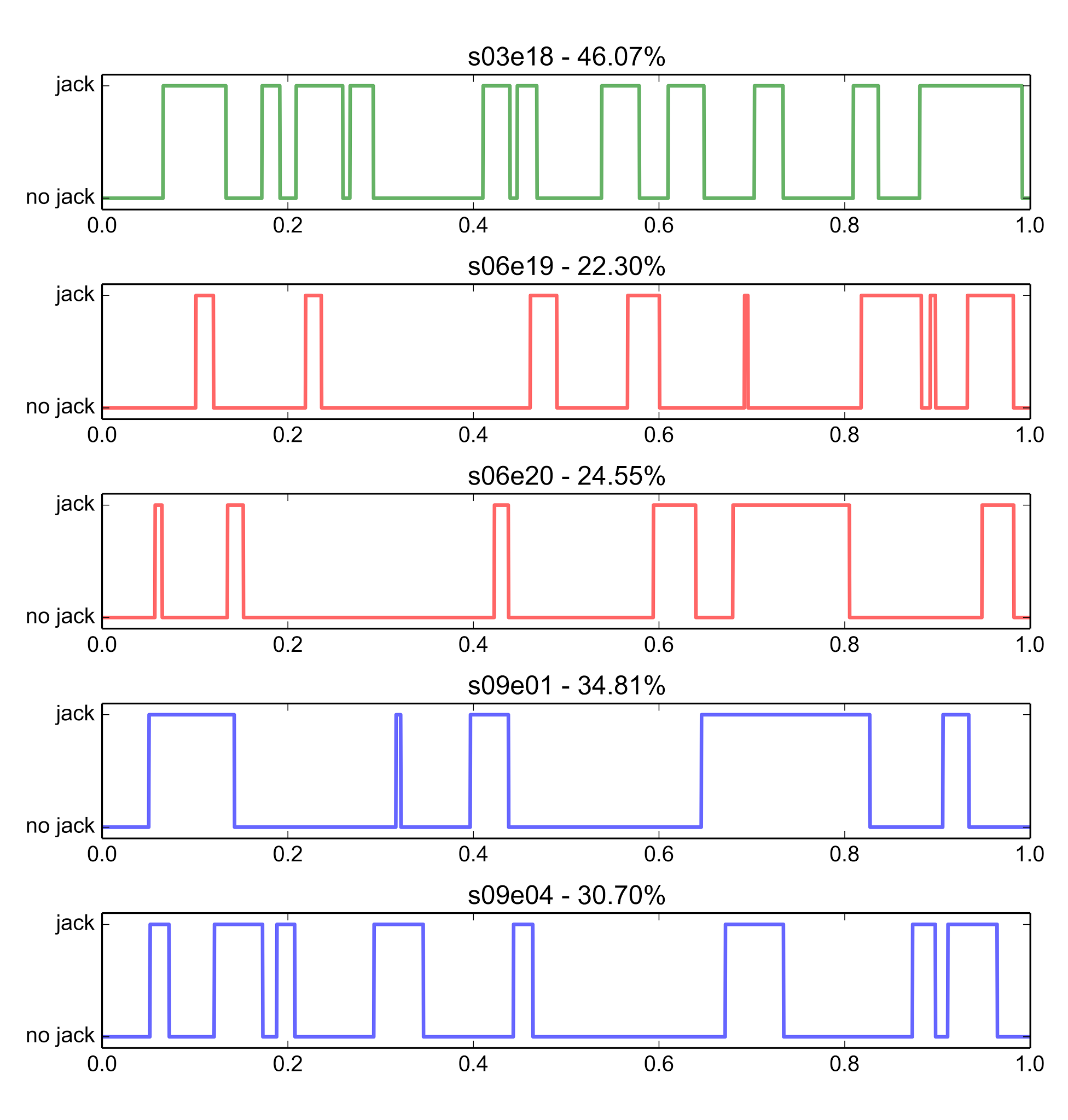 There are a few things worth noting here — first, look at the “dry” spells — in all four episodes that are, in my opinion, sub-par, there are *long* droughts without Jack making an appearance. There is also this bizarre counter-reliance on “checking in” — making a sub-30-second stop just to see Jack doing… whatever he is doing right then?