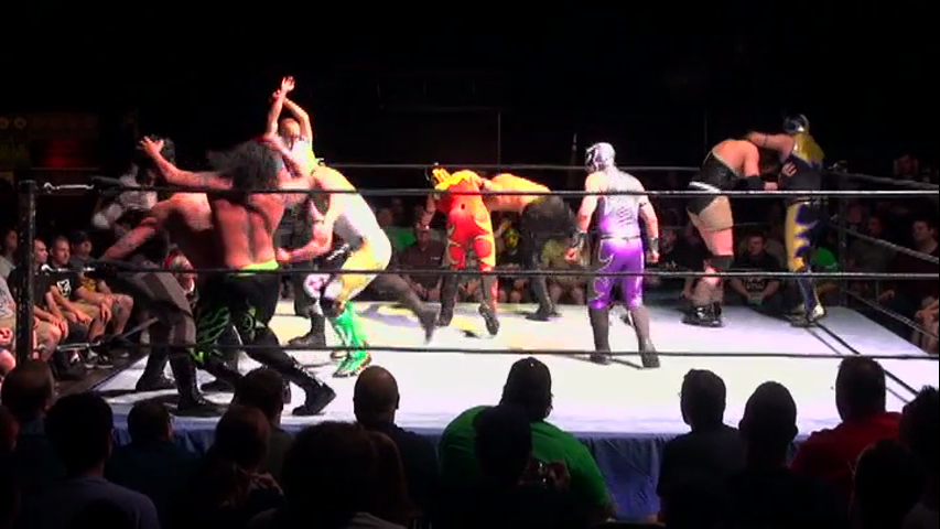 The Spectral Envoy (Blind Rage, Frightmare, Hallowicked, & UltraMantis Black) defeated the Gekido (Jigsaw, The Shard, & 17) & Missile Assault Ant) via Pinfall