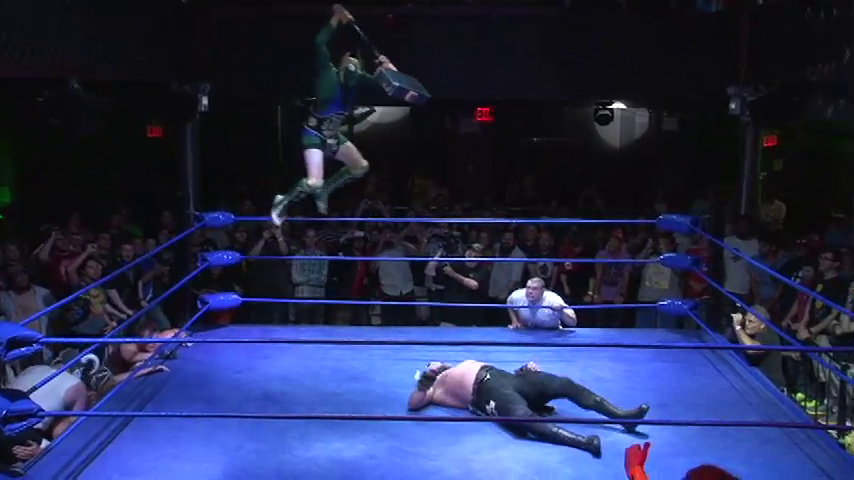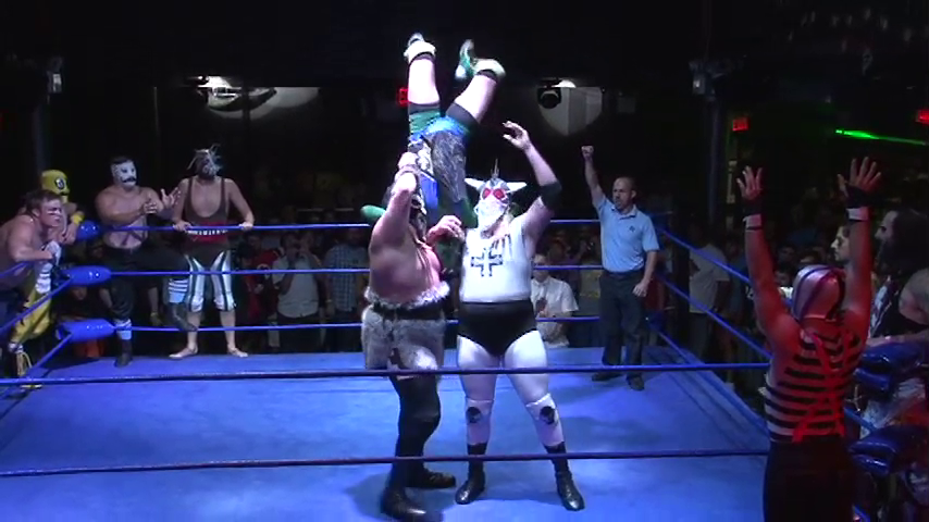 Frightmare grabbed Oleg’s helmet and bonked Blaster twice before hitting a Kneecolepsy and tapping him out with the Chikara Special at 14:16.