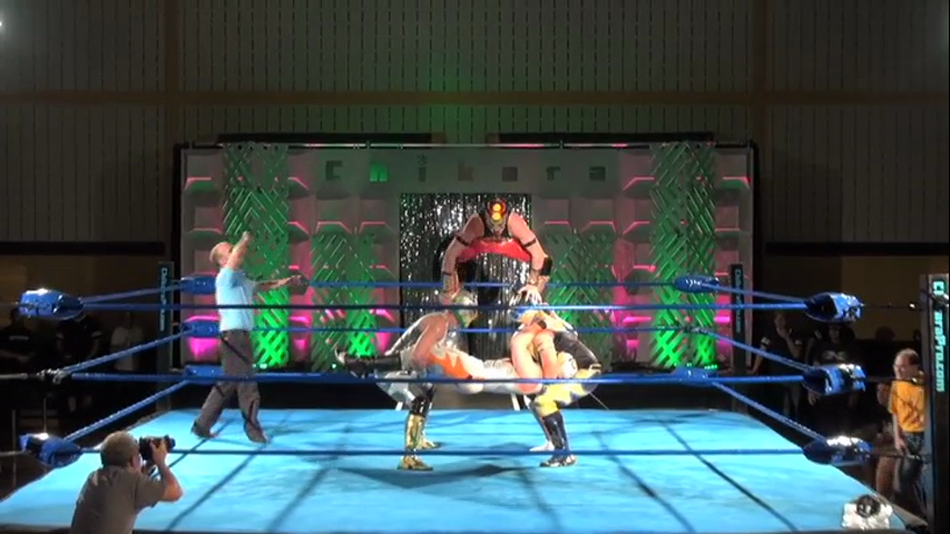 3Peck0 got in some great tandem offense early on. Peck and 3.0 work so well together. Peck made the mistake of head-butting the corner of Dr. Cube’s head. Does that count as a mask for disqualification purposes or would Dr. Cube die like Dragon Dragon?