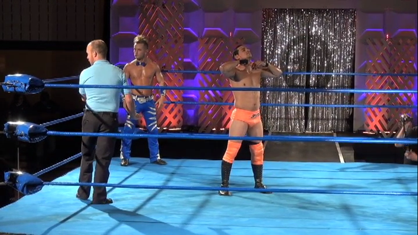 It’s the battle of the bowties! I thought I was really clever until the commentators make the same joke several times. Rockstar Spud is best known a Dixie Carter crony over at TNA. Spud pulled an extra bowtie out of his jock for Bryce, who seemed unnaturally happy about an object hanging out next to someone’s junk for the last twenty minutes.