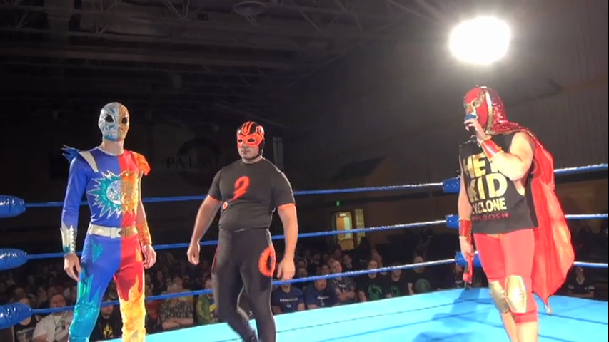 Kid Cyclone led his two compatriots, Equinox III and Create-a-Wrestler II, back out to the ring, called Deucalion a coward again and offered him one more chance to fight them fairly. Kid Cyclone was cool and relaxed on the microphone and has a good natural presence about him. Equinox III, meanwhile, looks like a stiff breeze could snap him in half.
