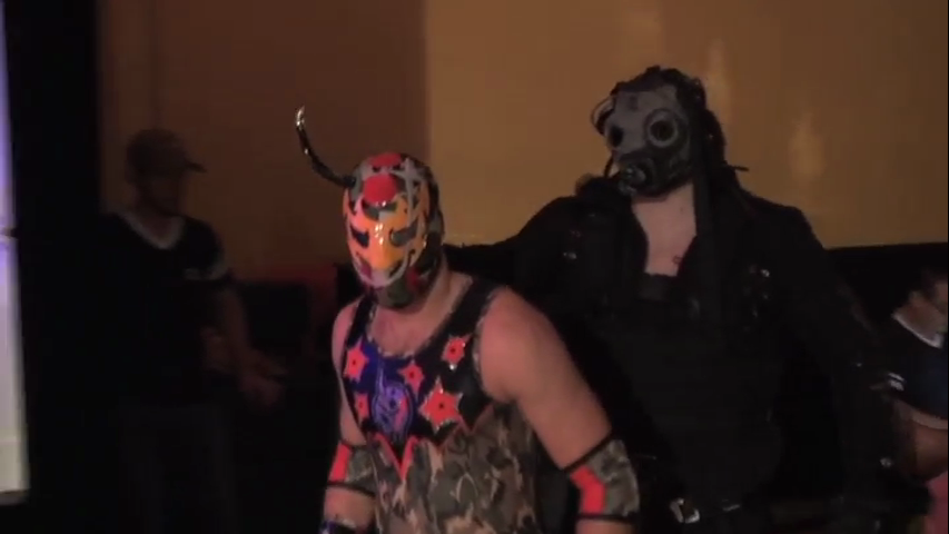 But he’s really huge and had full black contacts going and it’s pretty creepy. He chanted “cowards” at the GHM before snapping Equinox III and then CAWII over his knee with Chokebreakers. Kid Cyclone was next, but he squirmed away and retreated. For just a moment, he sat on the stage, horrified and nauseous over what his hubris had brought his friends.
