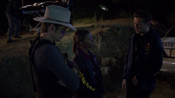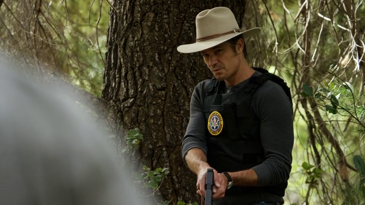 Then there’s Raylan. He and Boyd meet up again and the scene is as tense as expected. Something makes me wonder whether they’ll somehow end up working toward the same goal at some point this season as a fitting echo of season 1. Raylan and Tim partner up for the rest of the episode, making us wish they’d done this more over the past 5 seasons. They meet up with a couple detectives who have located Calhoun’s body (because bear season started that day). These guys are great partners as well and I wish we could have seen them before this episode (or I just don’t remember if we have). Way to go casting your small guest roles, Justified!
